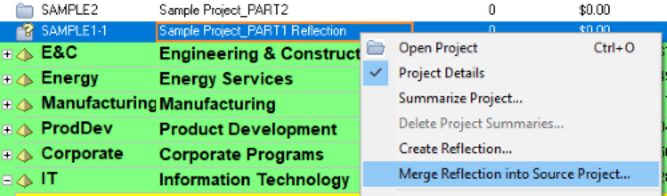 We now want to compare the project changes and update the Project Team, so we need to create a printing reflection difference report to compare and view the modifications. Go back to the Main Projects menu, right-click on the reflection project, and select “Merge Reflection into Source Project…”:
