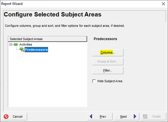 Next, highlight Predecessors under Activities in the Configure Selected Subject Areas box of the Report Wizard and then select “Columns”: