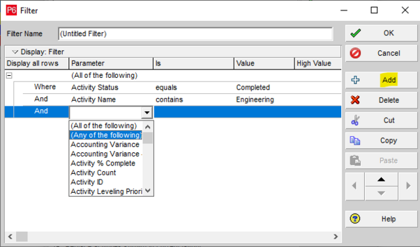Use the “Add” button to continue to add parameters under the “Any of the following” new indent category. These will be “or” conditions, so any of these commands can be met. In Primavera, you must differentiate between the start and the finish milestones. Do not forget to name your new filter.